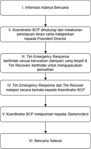 | Persiapan | 1. Data Tim BCP berikut nomor yang bisa dihubungi 2. Instruksi proses peralihan ke lokasi pengganti 3. Dana cadangan selama proses peralihan dan pemulihan |